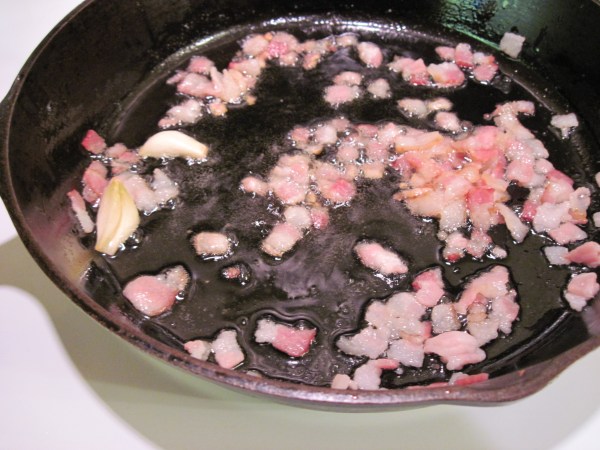 Heat the oil in a large skillet. Add the bacon and the garlic.