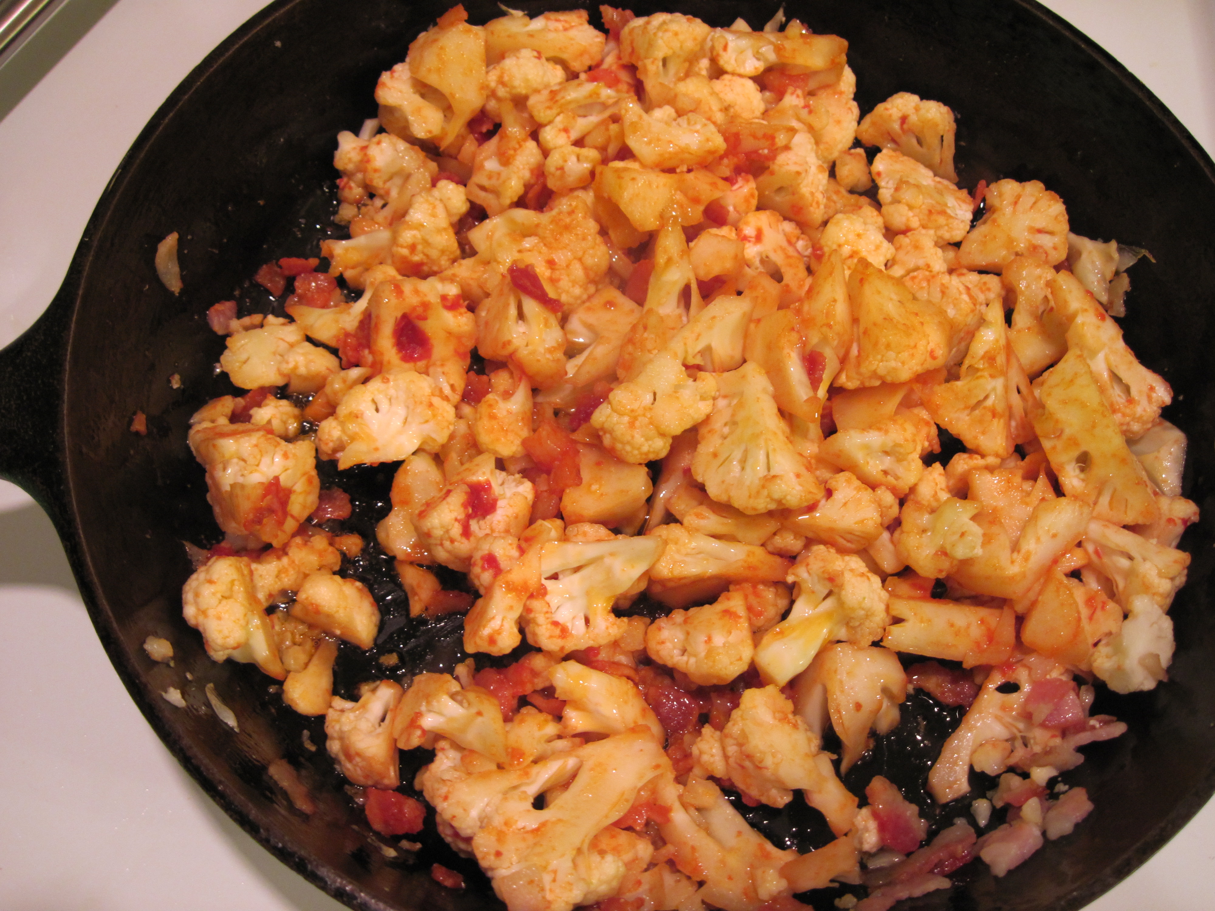 Remove the garlic when it is “blonde”. Wash and cut the cauliflower into pieces and then add it and the tomato paste to the skillet.