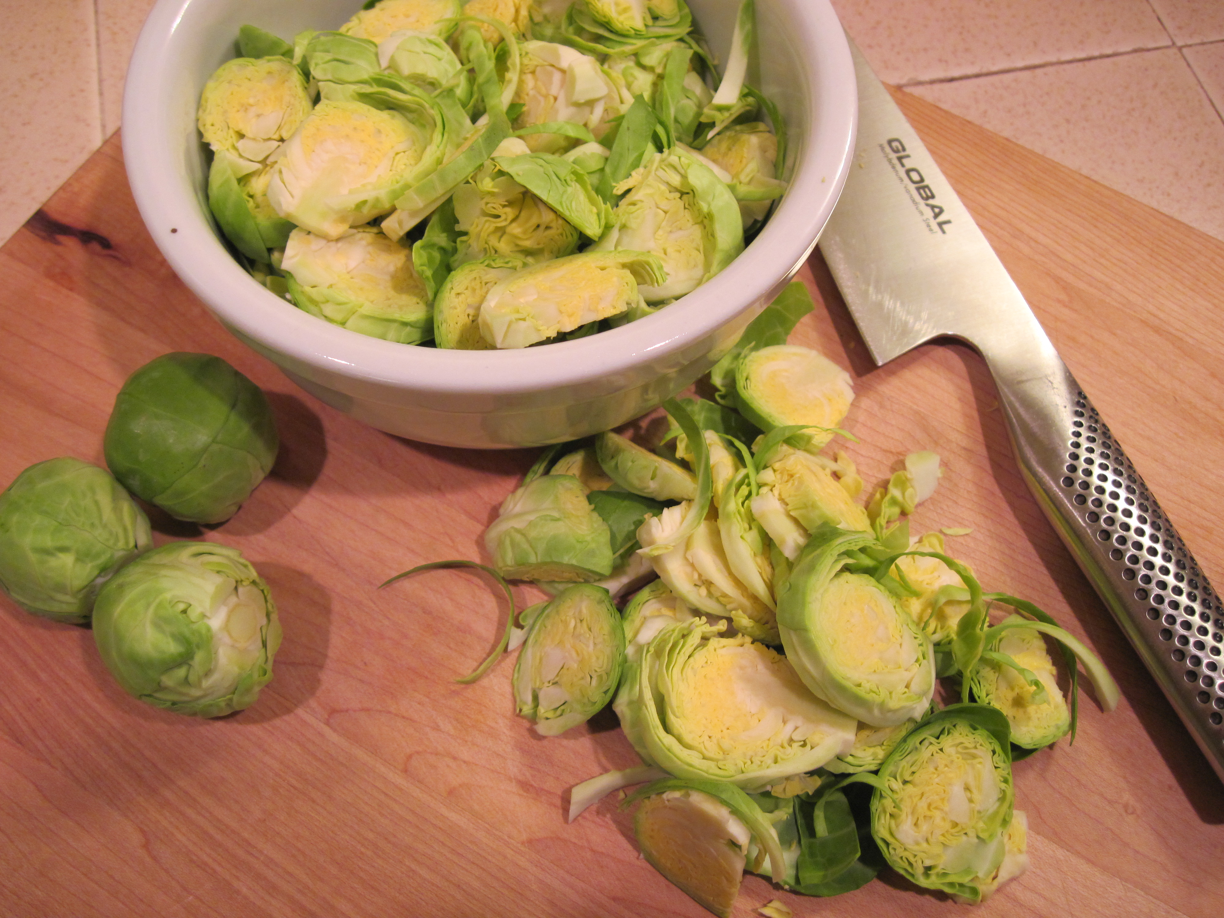 2. Trim the ends off the Brussels sprouts and slice them into ¼-inch slices.