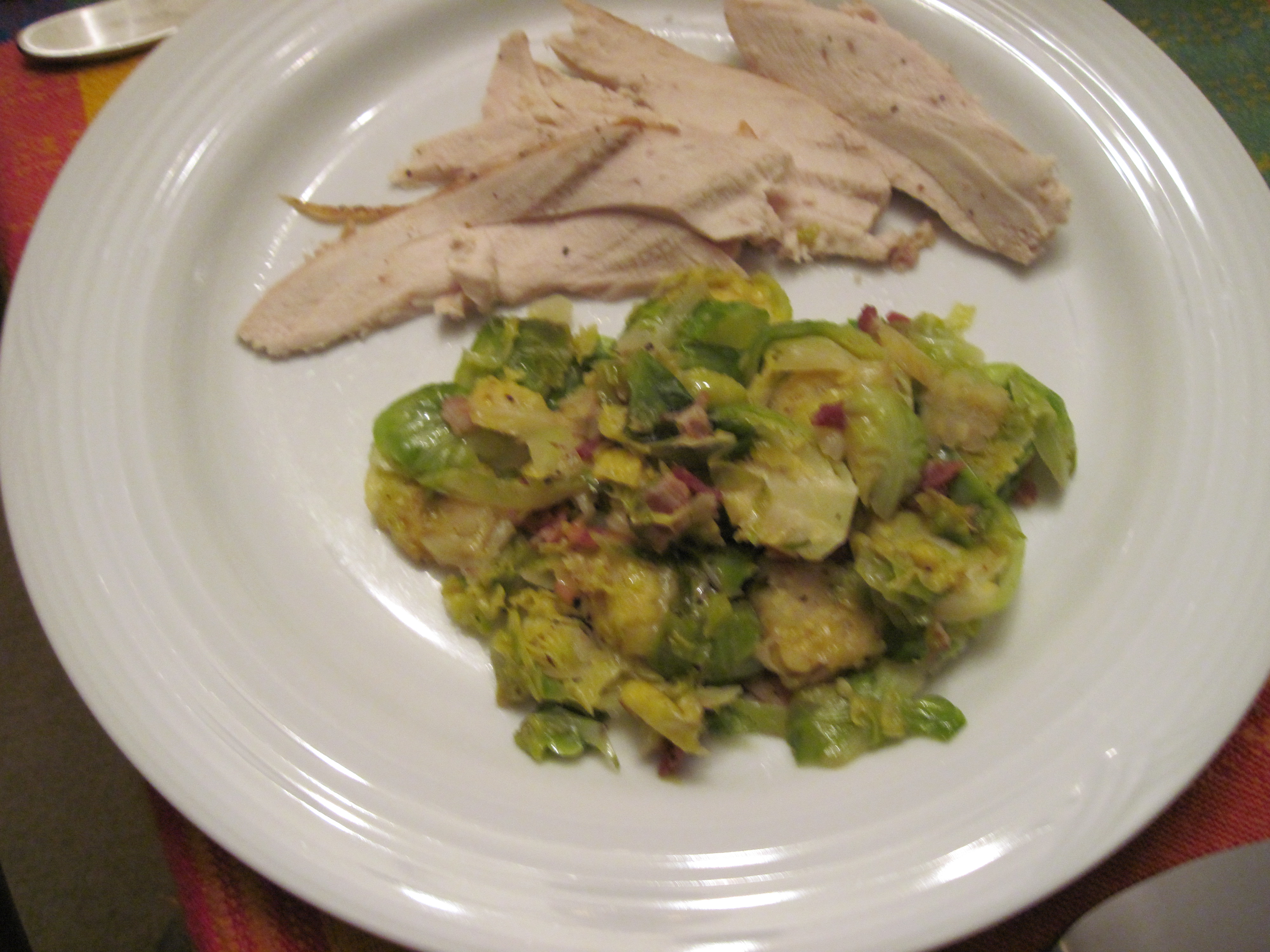 These Brussels sprouts made a great side dish with reheated leftover roast chicken!