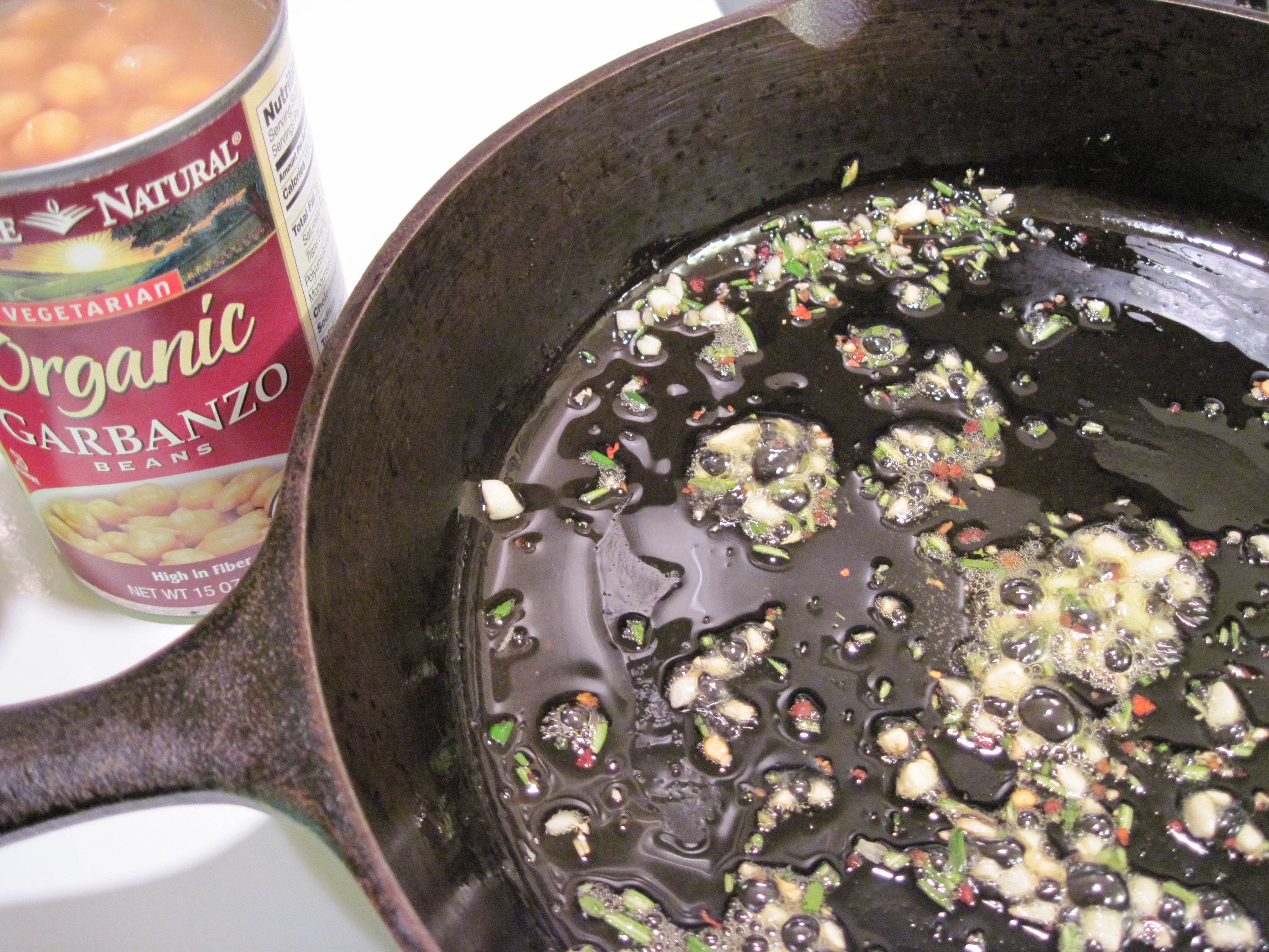 Add the chickpeas and all the liquid from the can. Simmer gently, uncovered, for about 5 minutes.