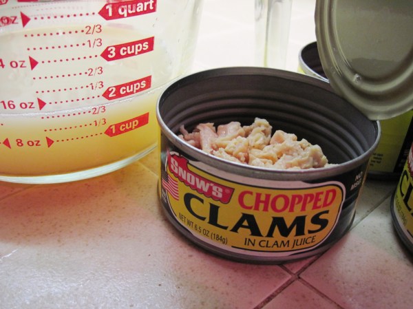Although clam chowder is best when made with fresh clams, my “pantry” clam chowder, made with canned clams, is pretty darn good. Look for canned clams that are as natural as possible—no MSG, for example. Last night I used 3 cans (6.5 oz. each) of Snow’s Chopped Clams. Sometimes I use 2 (10 oz. each) cans of baby clams instead.