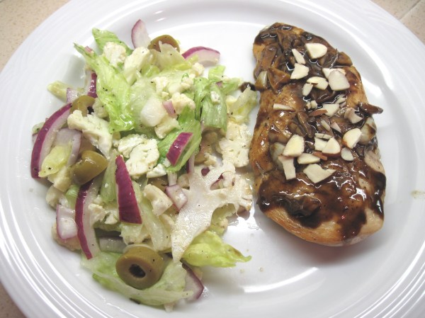 P.S. The salad was quickly put together; it was just sliced cauliflower, lettuce, red onions and the last of my marinated olives all tossed with olive oil and white balsamic vinegar. Salted and peppered, of course.