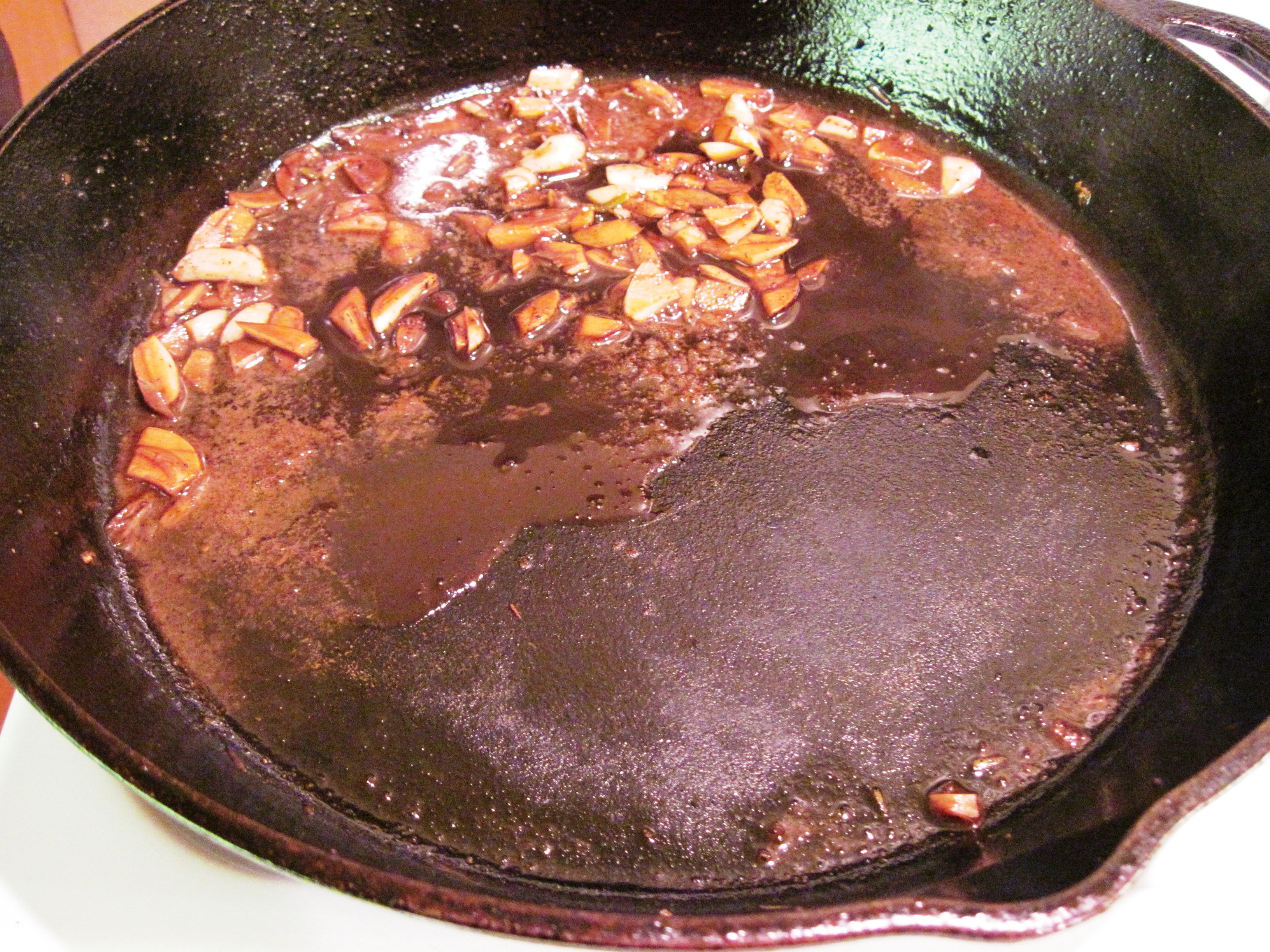 I used my cast iron pan, which was probably not the best choice for this recipe. It cooked beautifully, but the sauce was probably darker than it would have been in a different pan. And now I have to re-season my pan after reducing the vinegar in it… Sigh…