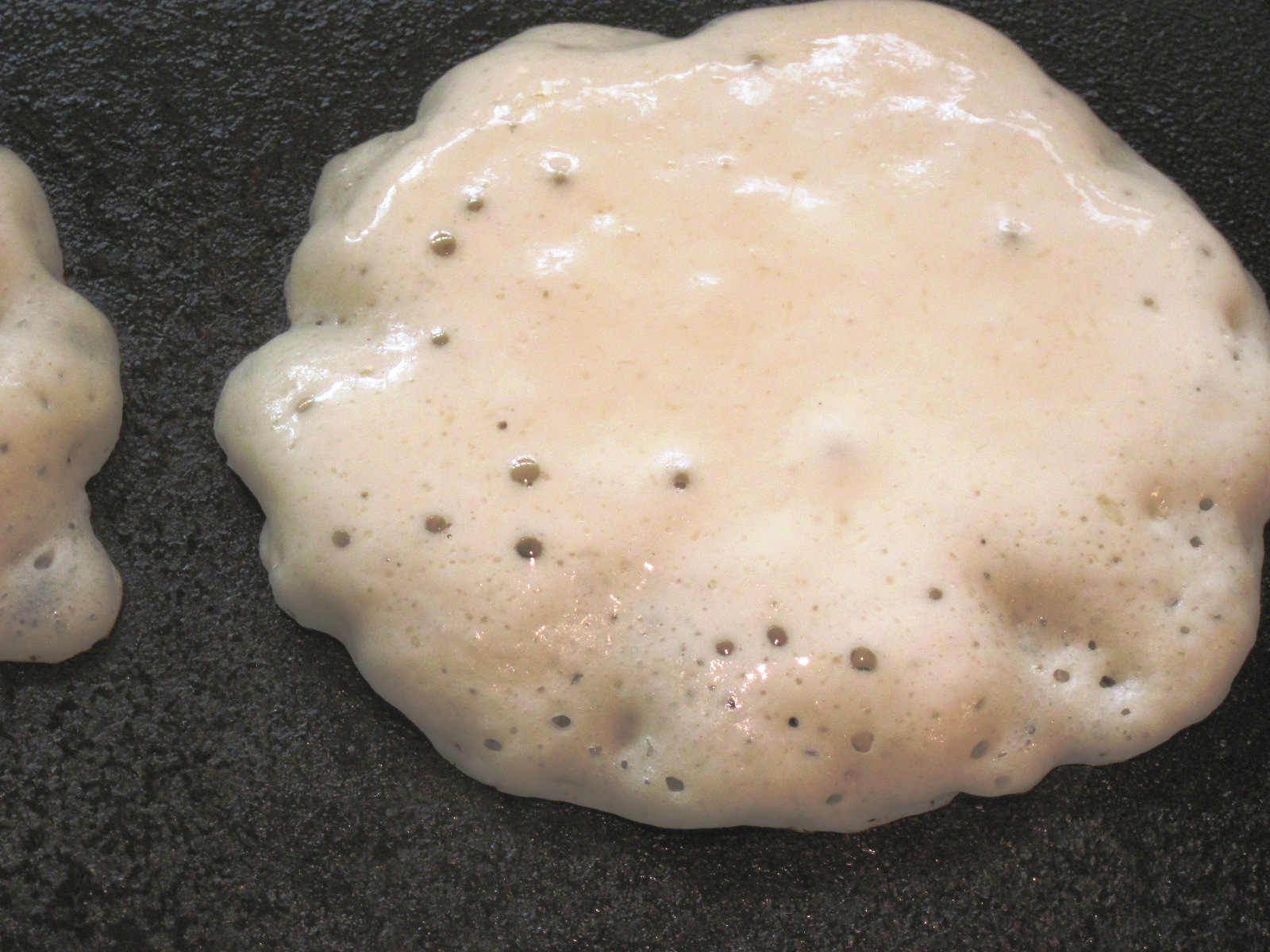 4. Cook until the pancakes are dry around the edges and there are bubbles on the top. The one below is just about ready.