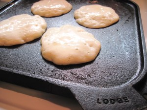 The key is to give it plenty of time to heat up over medium – medium high heat. (On my electric stove, just over medium heat works well.) When it’s had enough time to heat up, it will be hot all the way out to the edges. (You could actually use a large cast iron skillet, but it’s definitely easier to flip the pancakes on a griddle.)