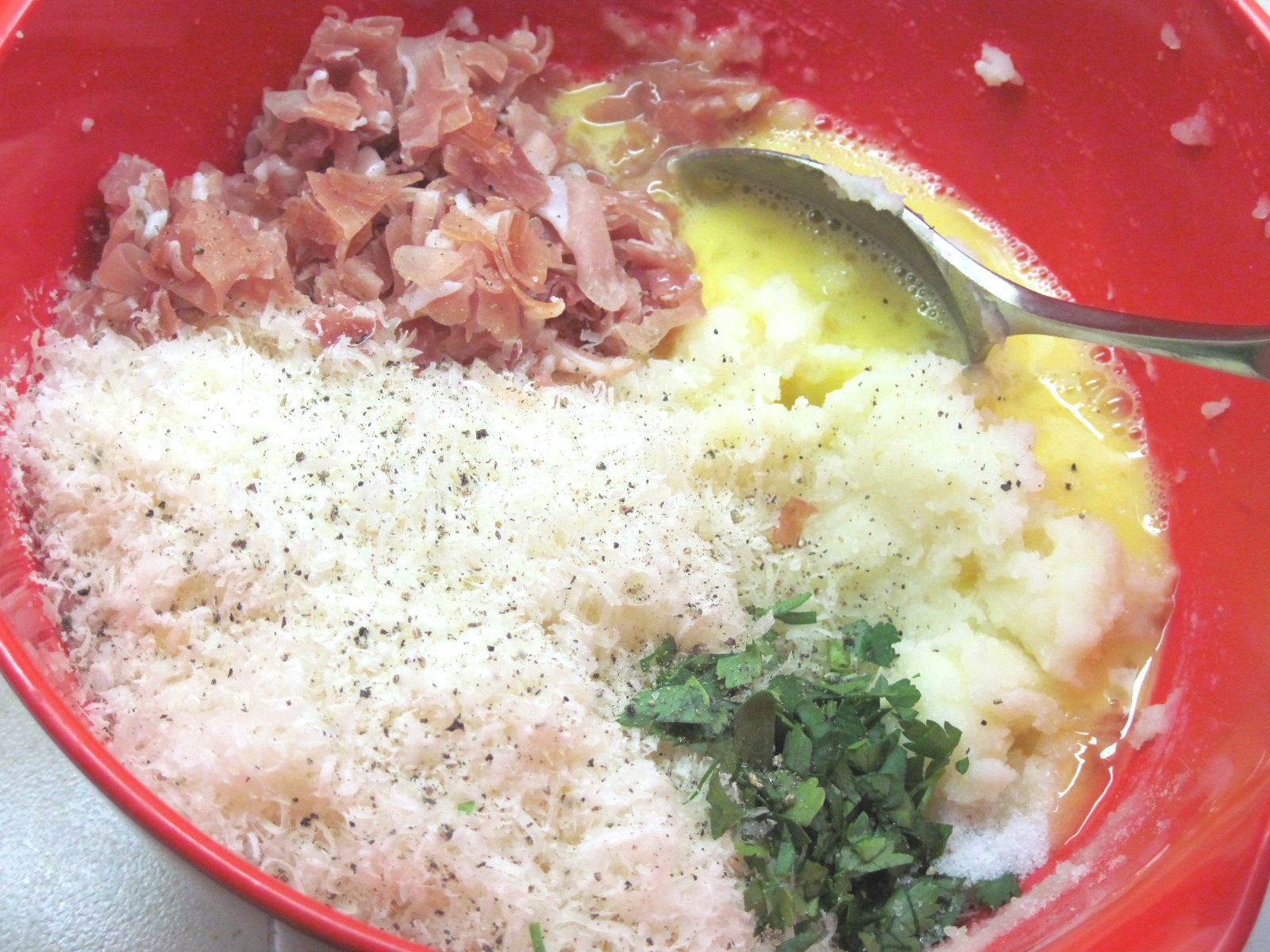Blend in the butter, parmesan, Romano, eggs, prosciutto or salami, the parsley, salt and a couple of grinds of black pepper. Add the milk and stir it well.