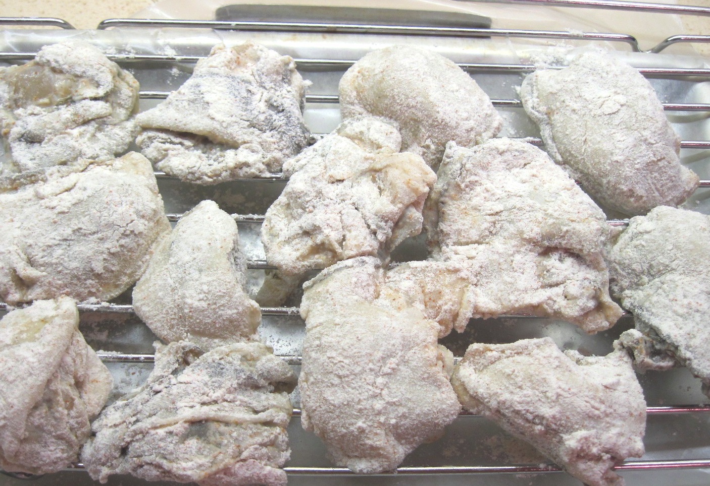 3. Dredge the oysters in the flour mixture and put them on a rack for a few minutes.