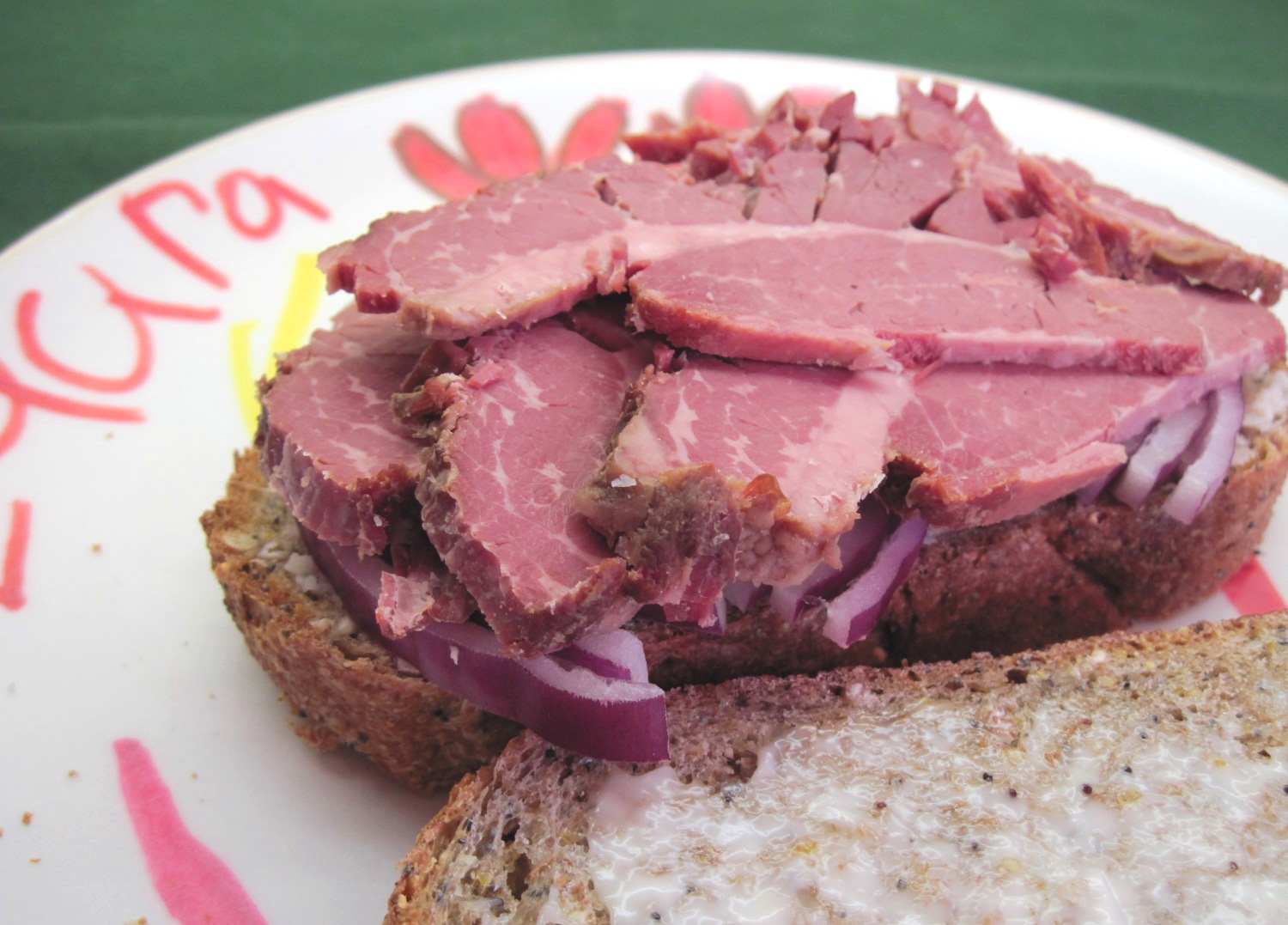 * Corned beef sandwich, just the way Bob likes it! Lots of horseradish, a bit of mayo, lots of sliced onions, and corned beef, all on lightly toasted Essential Baking Company Mille Grane bread: