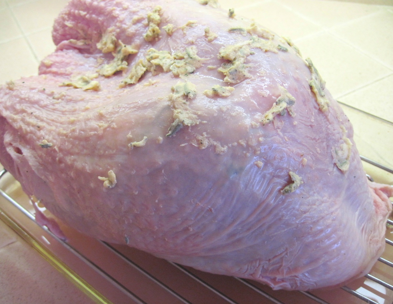 Pat the turkey breast dry with paper towels. Put the turkey on a rack in a pan.