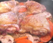 1. In a skillet, brown the chicken on all sides in hot oil for about 15 minutes total.