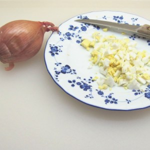 Still have Easter eggs in the refrigerator? Here’s a salad you might want to try. I found it on the epicurious website and it’s from the January 2003 issue of Gourmet magazine. I adapted it to serve 2.