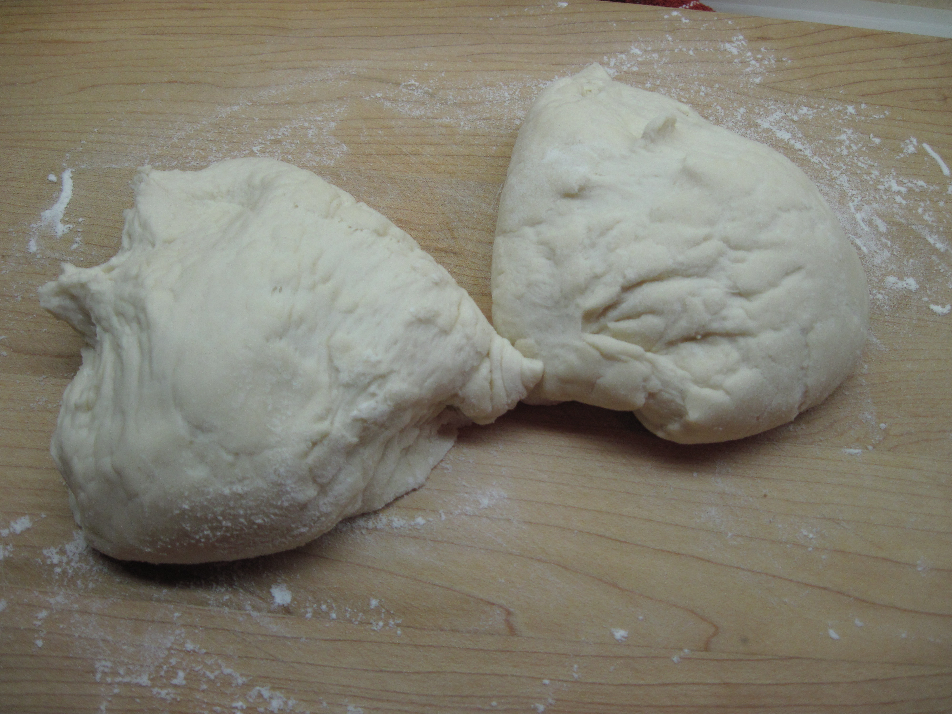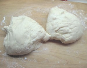 7. When the dough is ready, divide it into two pieces. You can make two pizzas, or refrigerate or freeze one of the pieces.