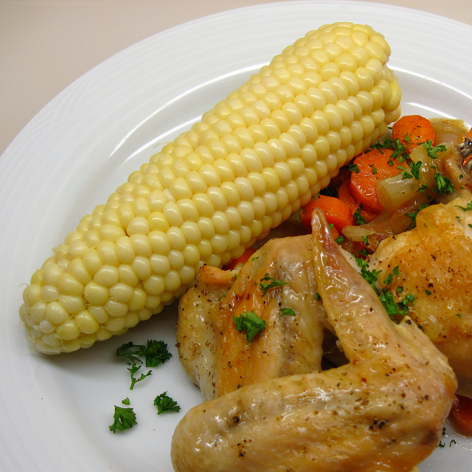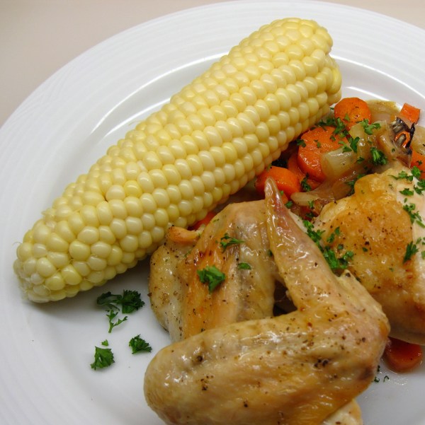 I could not resist the display of corn at Metropolitan Market yesterday. It was from California and looked so fresh! So we had corn with last night’s Quick Roast Chicken Parts with Carrots.