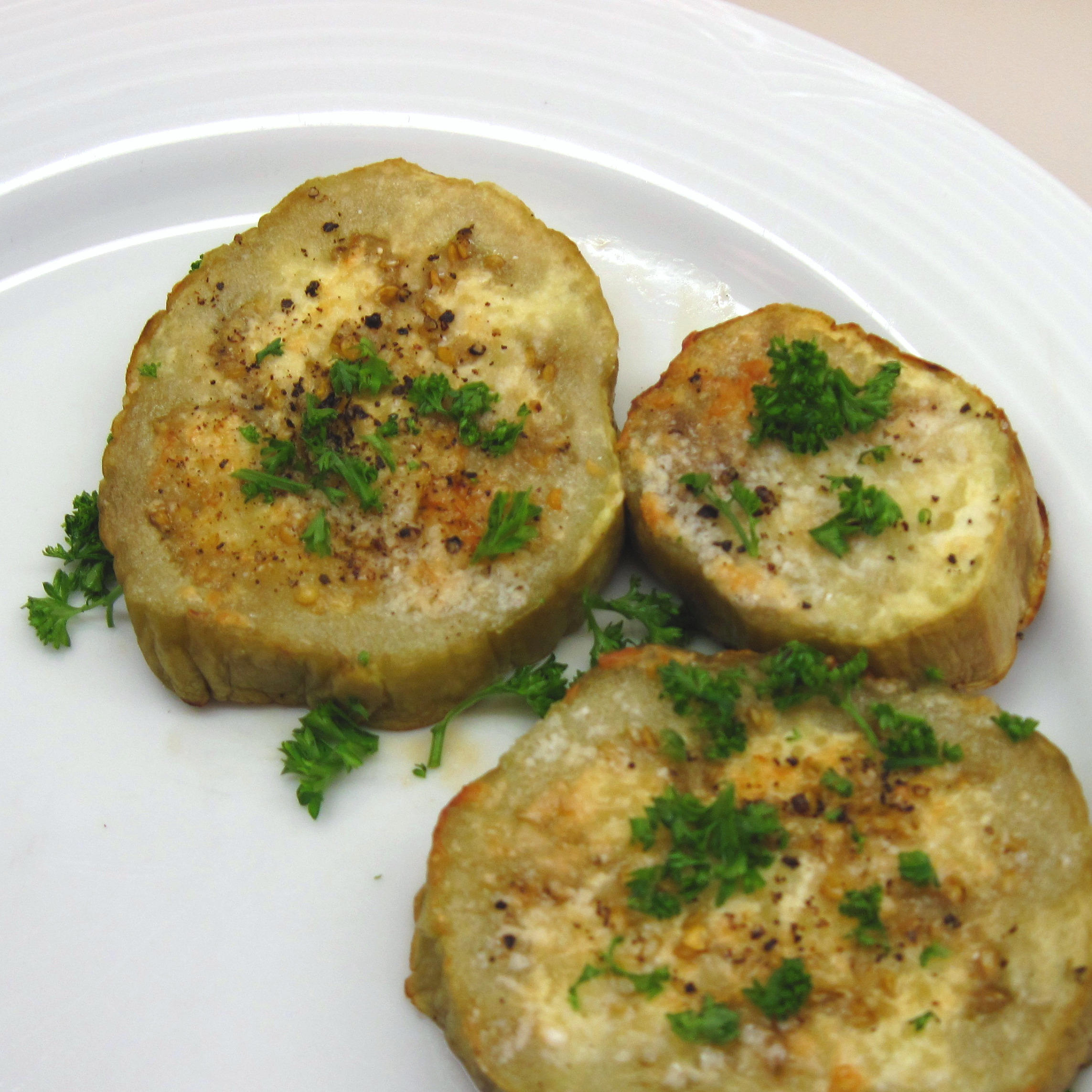 3. Combine the butter and Parmesan cheese; spread the mixture on both sides of the eggplant. Sprinkle both sides with salt and pepper.