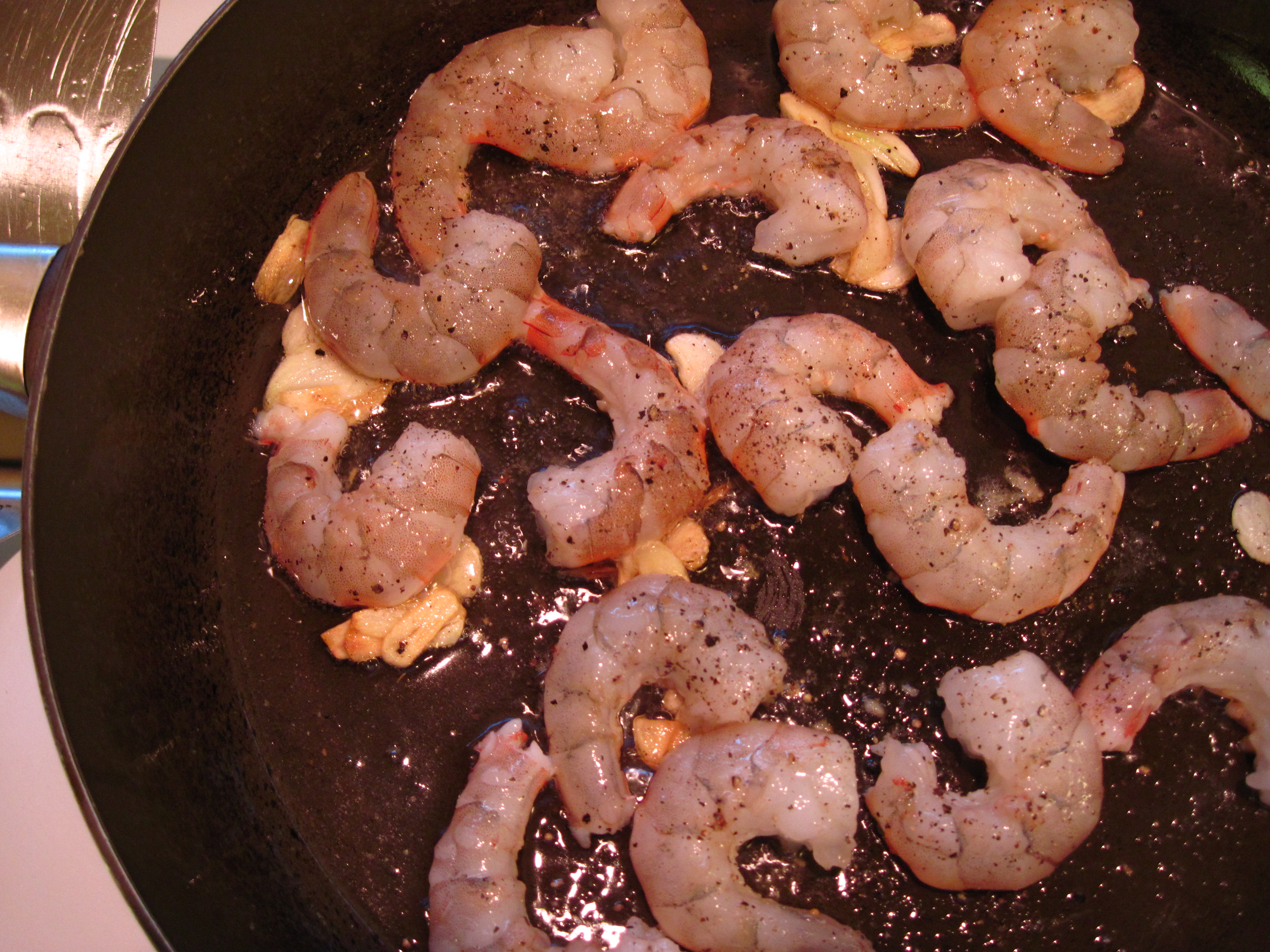 3. Raise the heat to medium. Add the shrimp and sprinkle with salt and pepper.