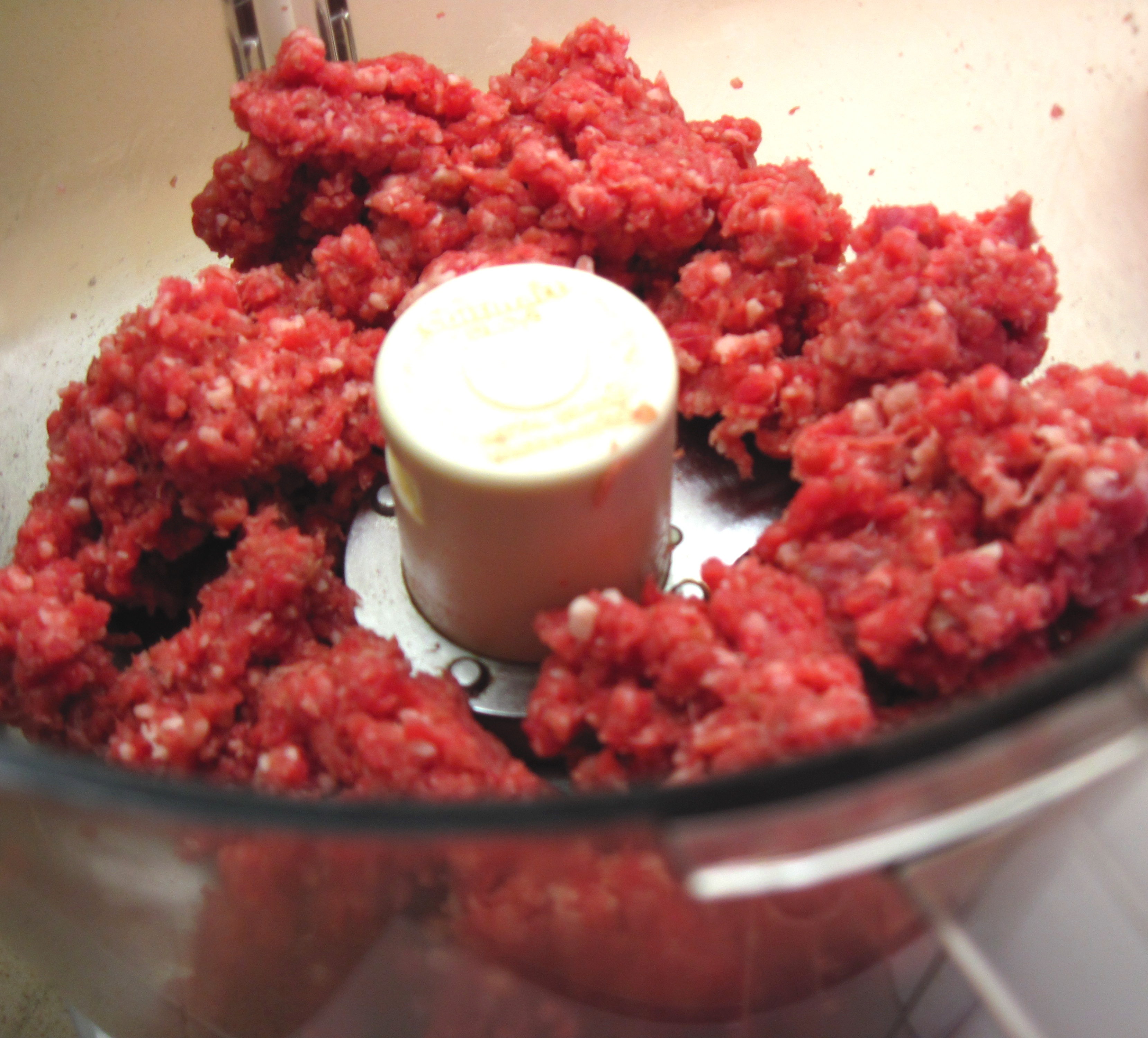 I processed the meat in two batches; it seemed that 1½ pounds might be too much to do at once in my average size Cuisinart. Cut the meat into 1½ – 2 inch cubes. Put half of the meat in the food processor and pulse it until it is ground to the consistency you want. It happens very quickly. Check during the process to see if it needs to be redistributed. Remove the ground beef and add the other half to grind it.