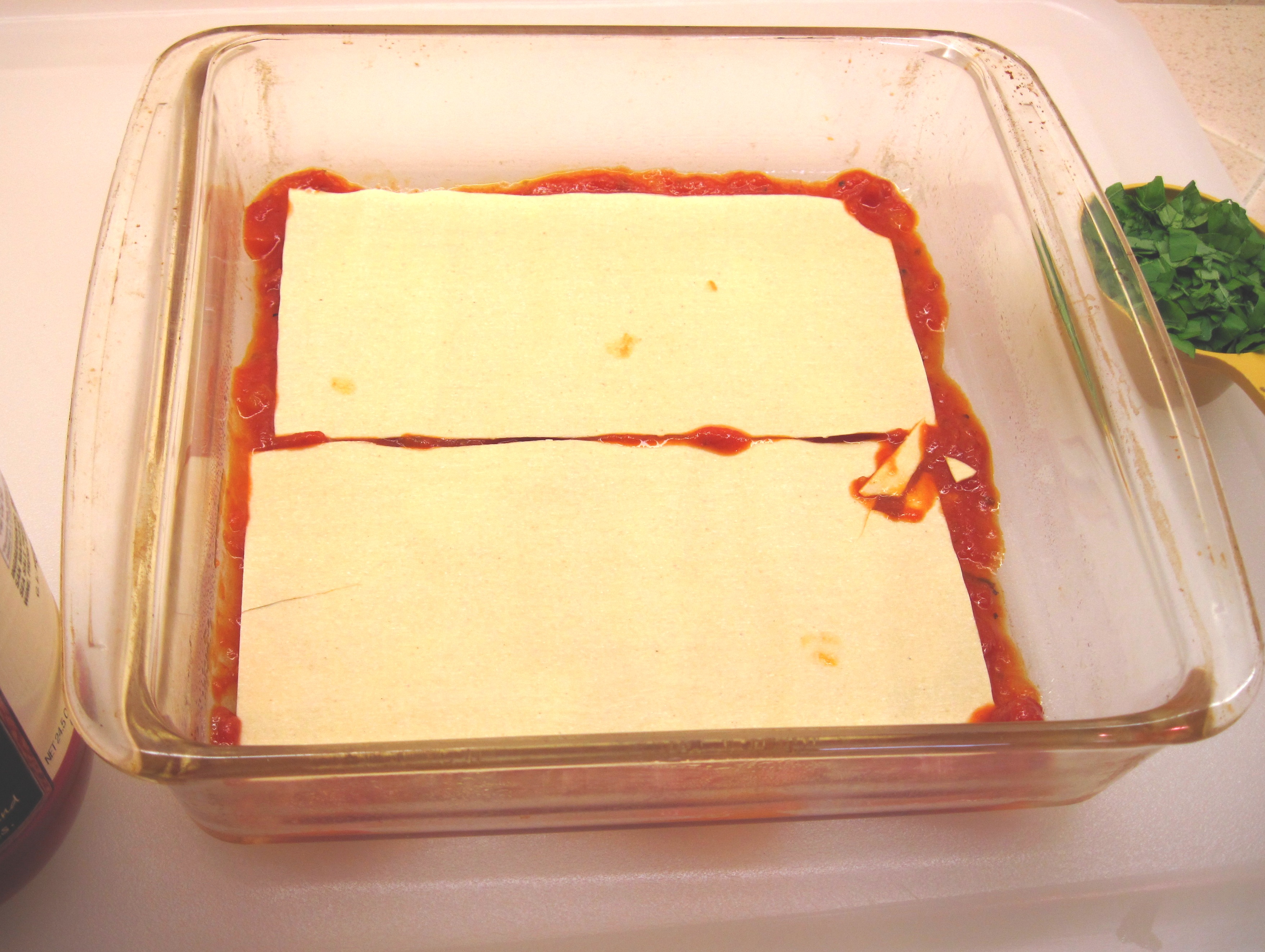 4. Put about ½ cup tomato sauce in the baking pan. Put 2 lasagna noodles on top.