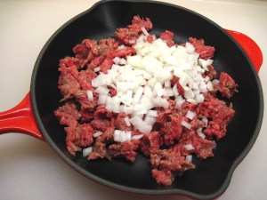 1. Cook the ground beef and onions together in a pan until the ground beef is done. Drain off any extra fat.