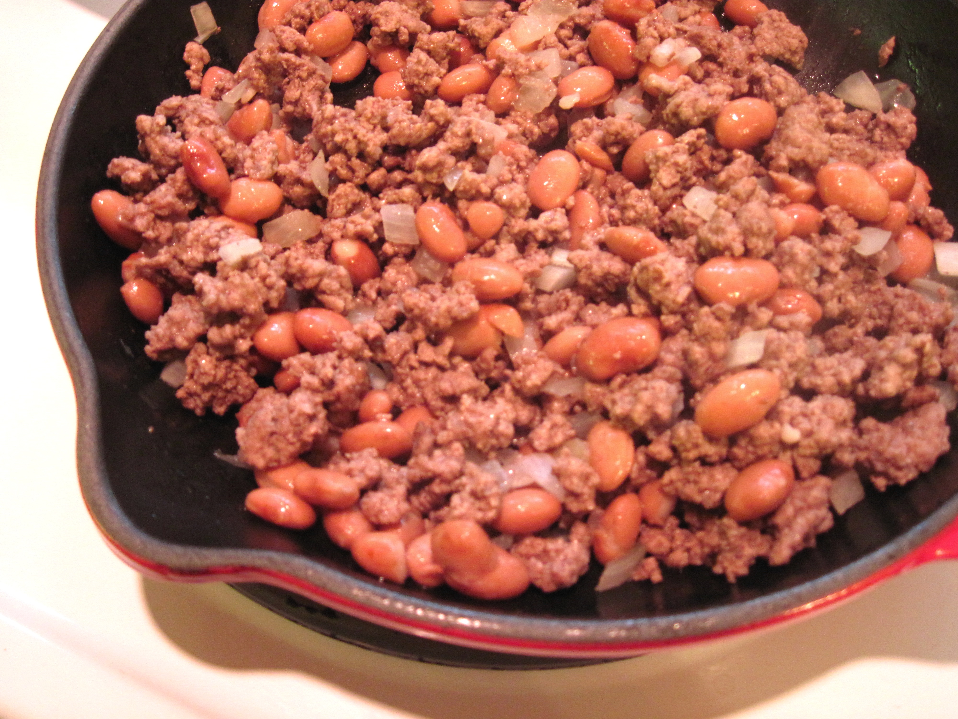 2. Add the beans, chili powder, cumin, and ketchup. Cook, covered, over medium-low heat for about 5 minutes.