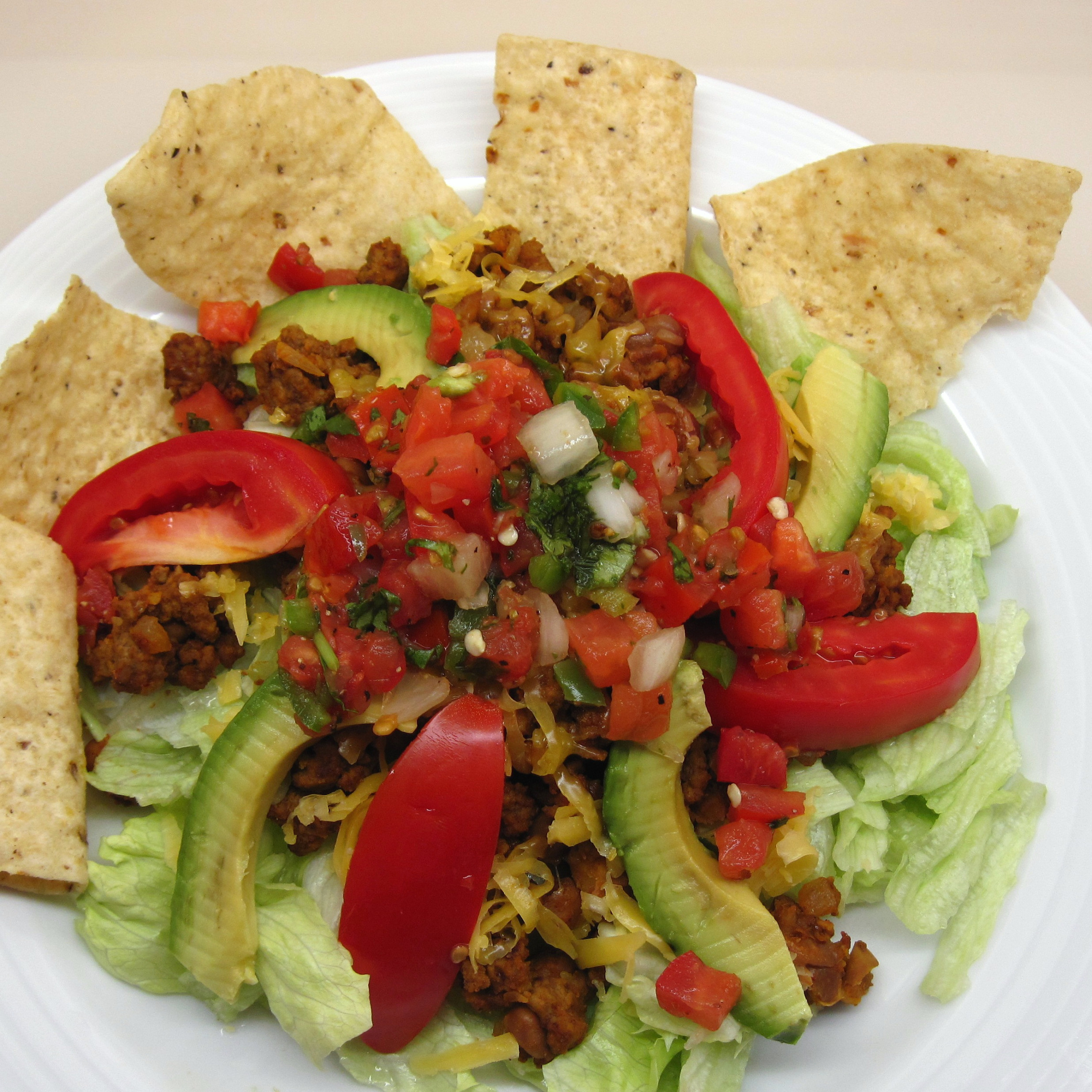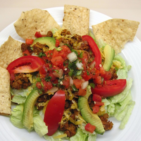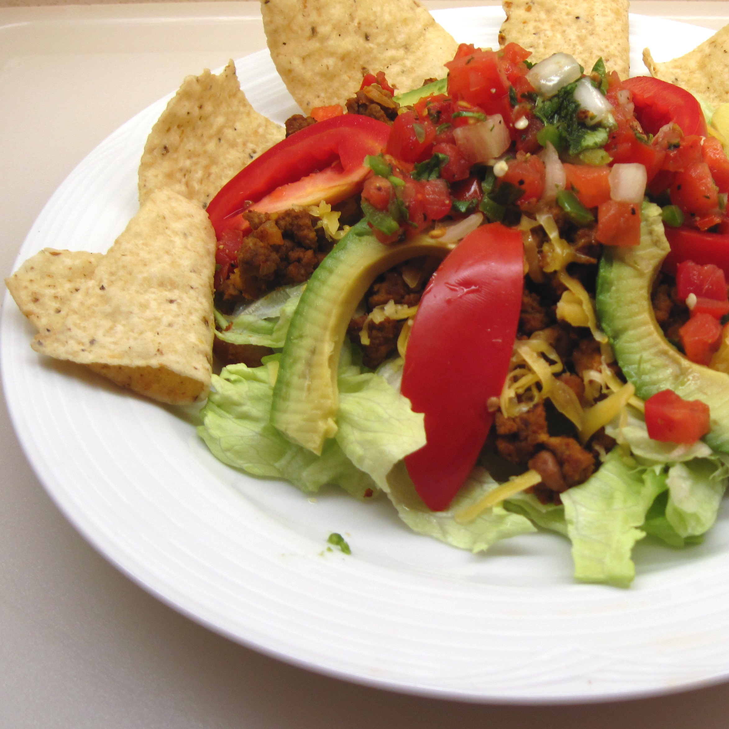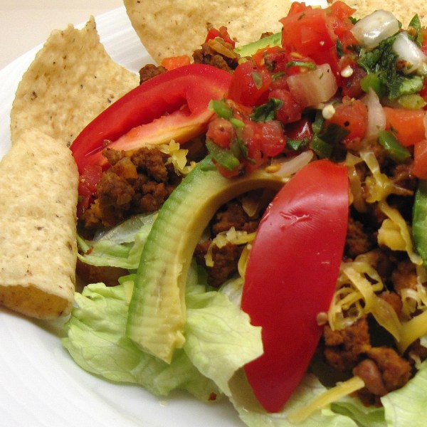 4. Top the lettuce with the ground beef and beans mixture. Sprinkle the cheese on top. Arrange the tomato and avocado slices on top. Serve with a few tortilla chips. Top with a bit of chunky fresh salsa, if desired.