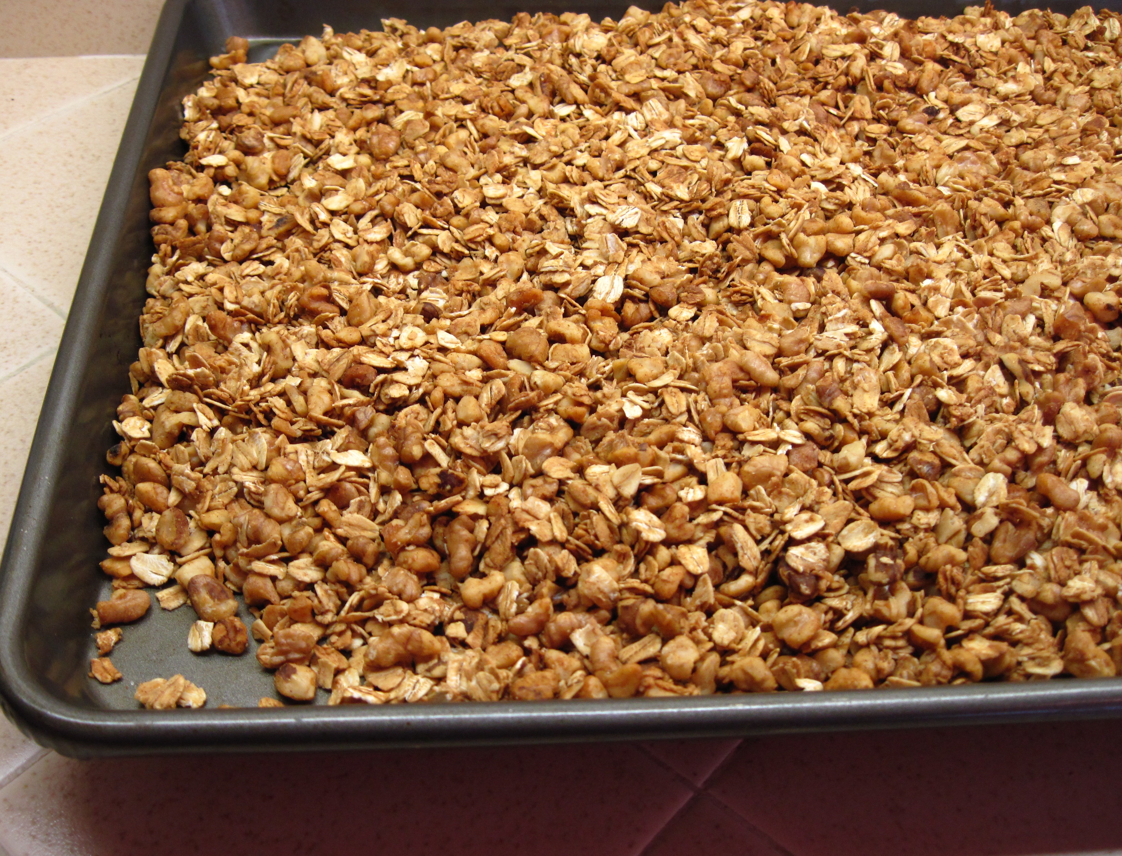 I just made a new batch of Go Nutty Granola. I used 1/4 cup coconut oil (heat the coconut oil in the microwave oven for about a minute to make it liquid) and 3/4 cup honey this time, and I baked it for about 23 minutes. I think it’s even better this time! Keep in mind, though, that you can use as little or as much oil or honey as you want. The recipe is extremely flexible! 🙂