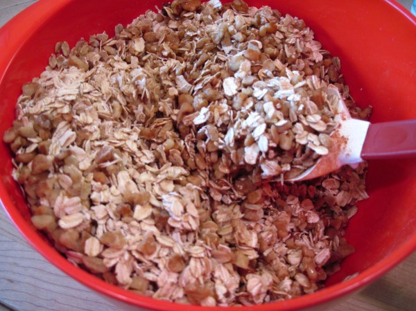 5. Pour the honey and oil over the granola and stir well so everything is well-coated. Sprinkle lightly with salt and stir again.