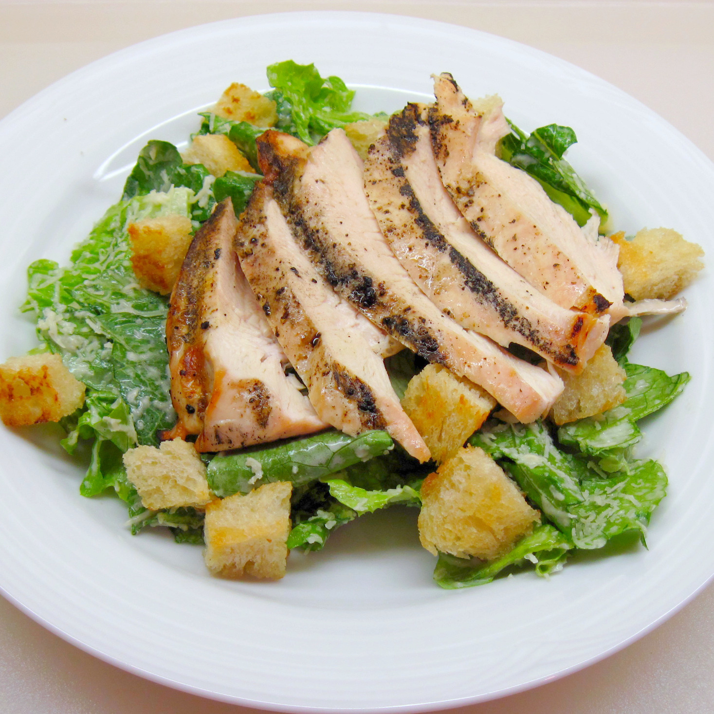 2. Lightly salt and pepper the chicken breast; grill the chicken for 3 minutes on each side, until done. Let rest while you toss the salad; then cut into slices.