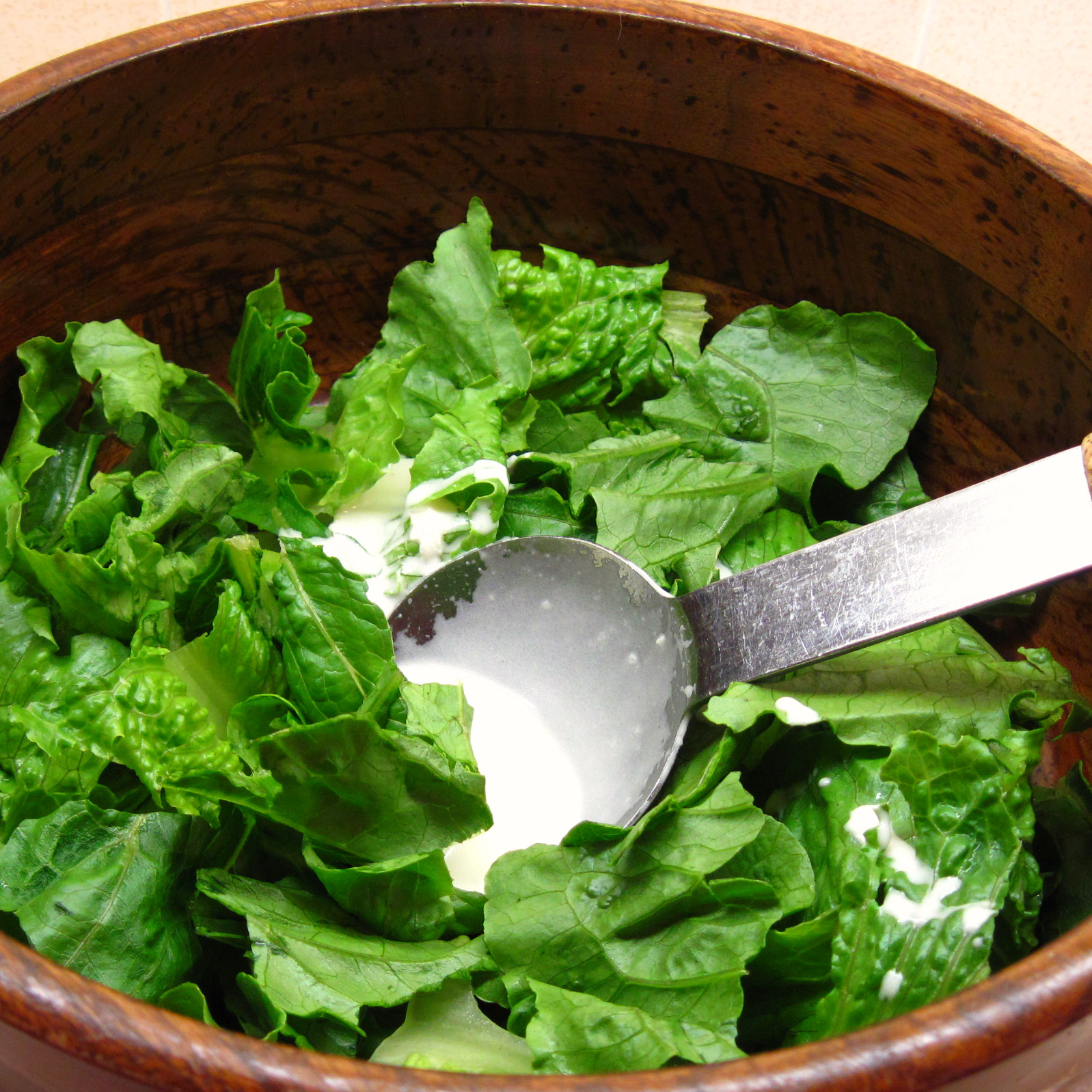 3. Toss the lettuce, cheese, and Caesar dressing together until the lettuce is well-coated.