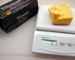 Here we’re measuring the weight of the cheese. When you shred 6 ounces of cheese you get about 1 1/2 cups of shredded cheese.