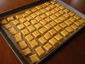 Cheese crackers! Who doesn’t love them? I had some Tillamook Extra Sharp Cheddar and decided I’d try to make my own. I adapted Smitten Kitchen’s recipe for Cheese Straws (which Deb adapted from The Lee Bros. Southern Cookbook). I decided to cut the dough into little bite-sized squares. (Kind of like the crackers that come in the red box.)