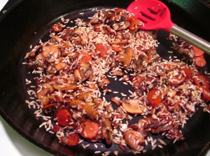 I found the recipe in the October 2010 issue of Cooking Light and I gave it a try last weekend. We both really liked it, but I felt the recipe needed a bit of “tweaking”. The rice was a bit too dry; it was almost crunchy.