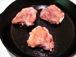 3 or 4 bone-in chicken thighs , skinned (grab the skin with a paper towel to easily pull it off)