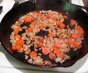 6. Reduce the heat to medium. Add the onion and carrot to the pan, and cook, stirring occasionally, for 4 minutes.