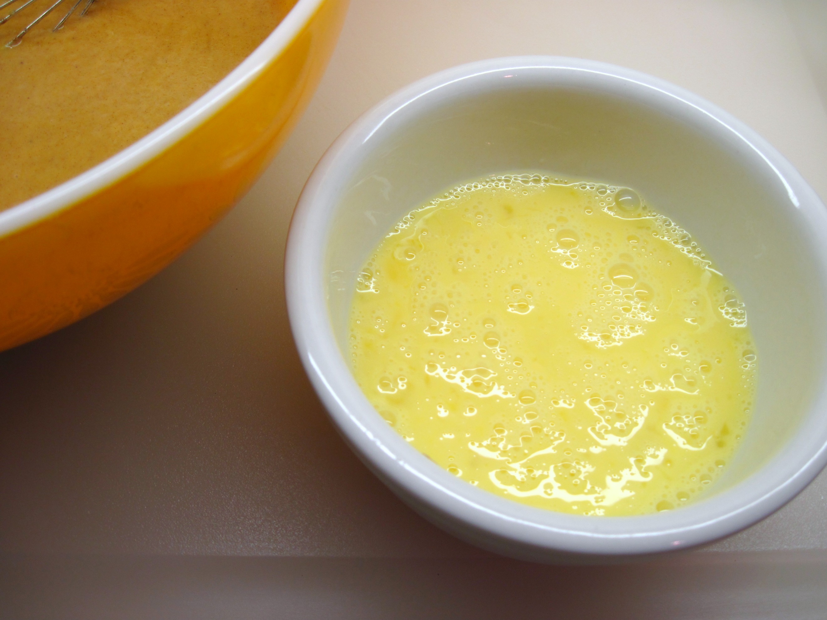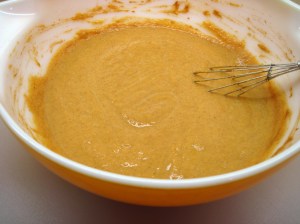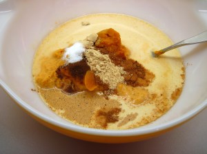 7. Stir the eggs into the pumpkin mixture. Don’t over-beat. Just stir until it’s all blended.
