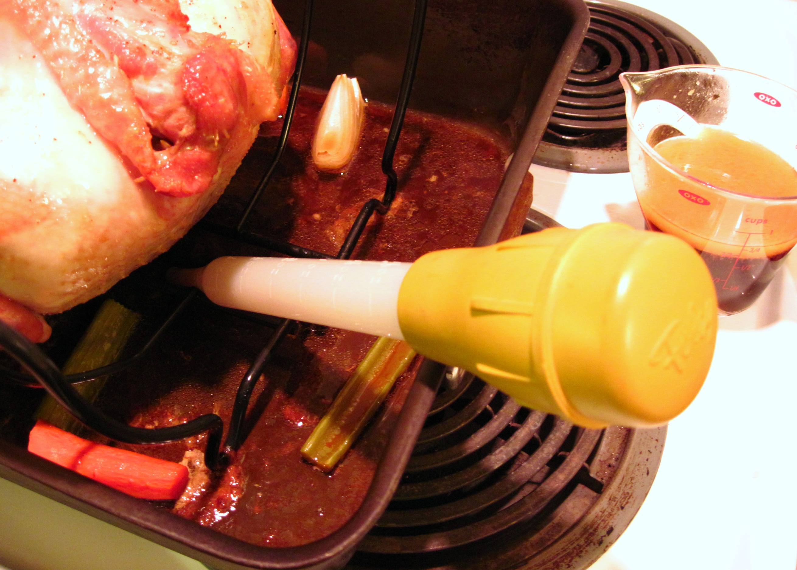 Using a bulb baster to get some broth from the turkey pan