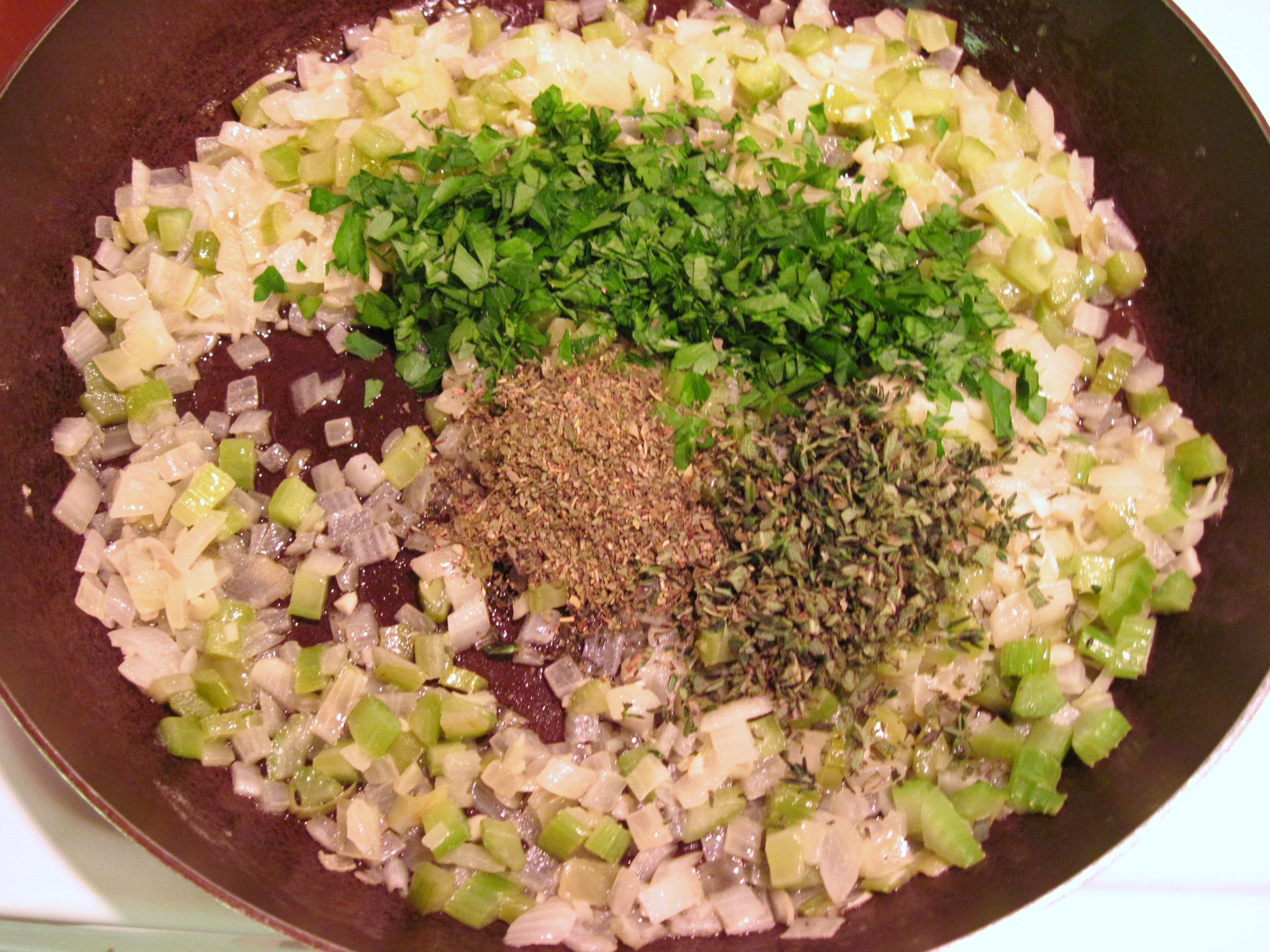 3. Stir in the sage, thyme, parsley and poultry seasoning.