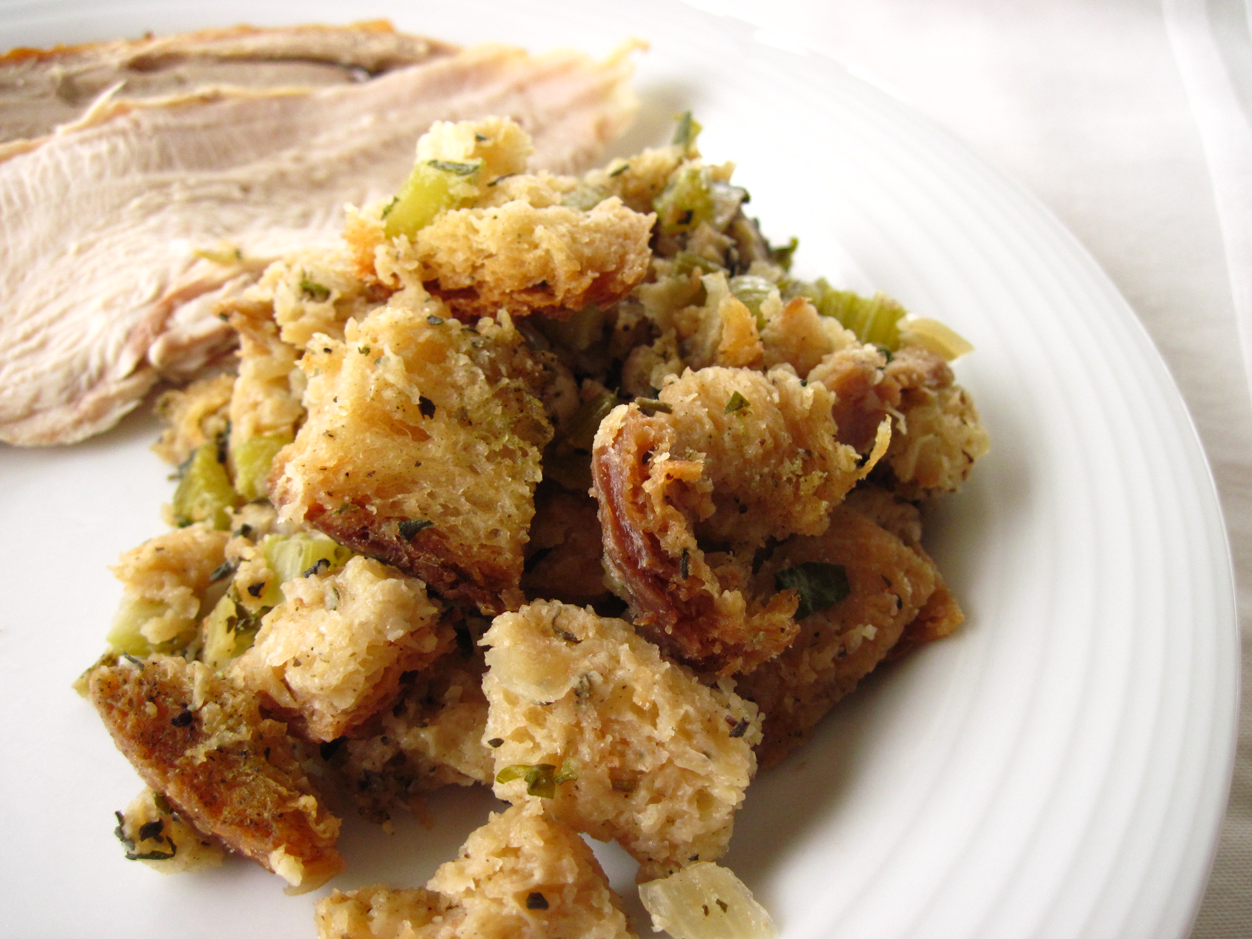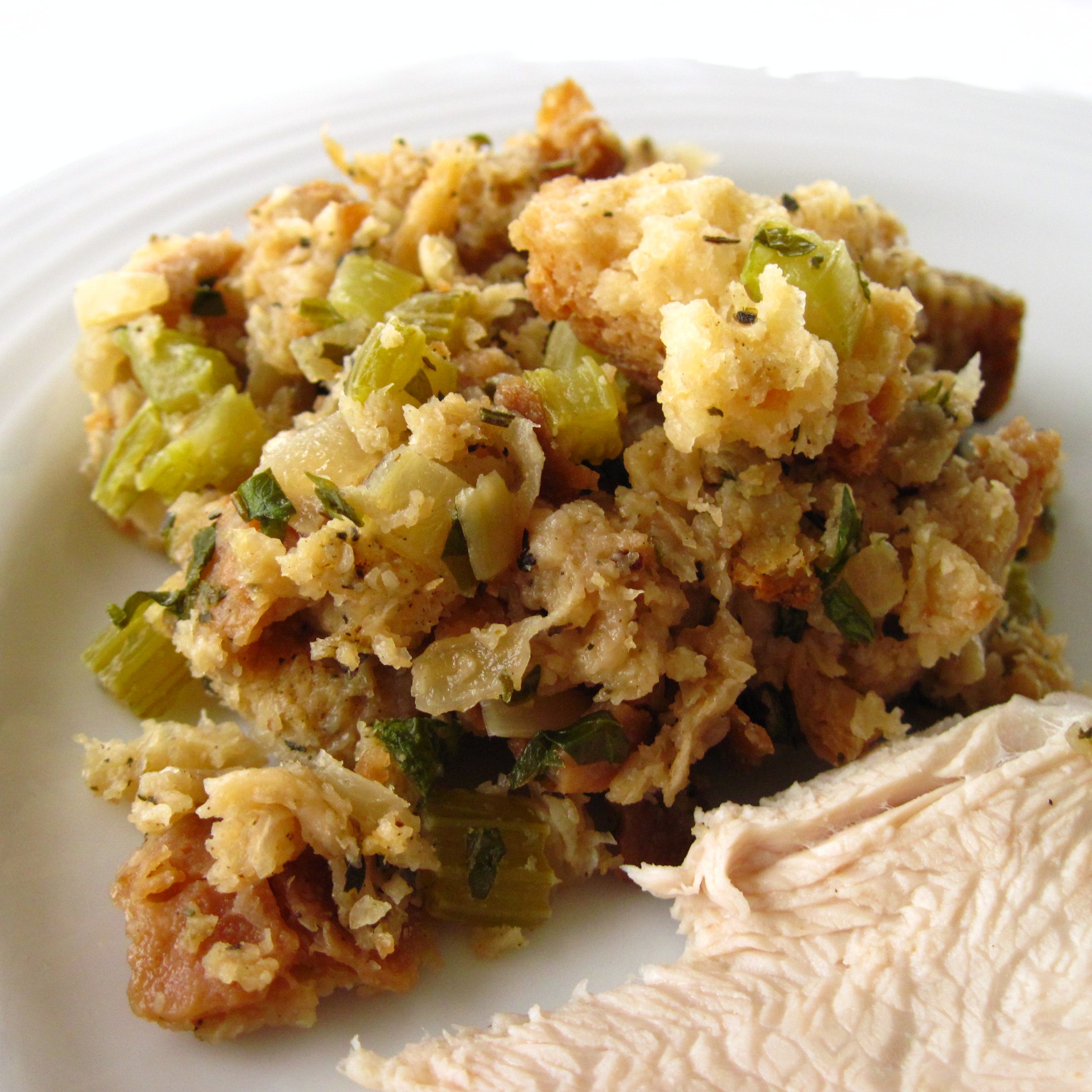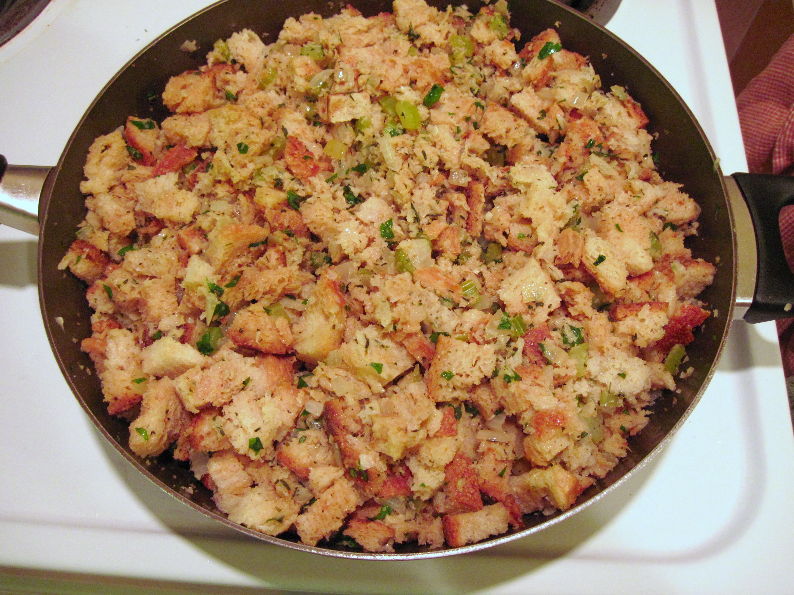 Classic simple stuffing with fresh herbs! We bookmarked this page and have been making this recipe for about three years now. We make it the day before and reach perfection by adding a pound of chopped roasted chestnuts.