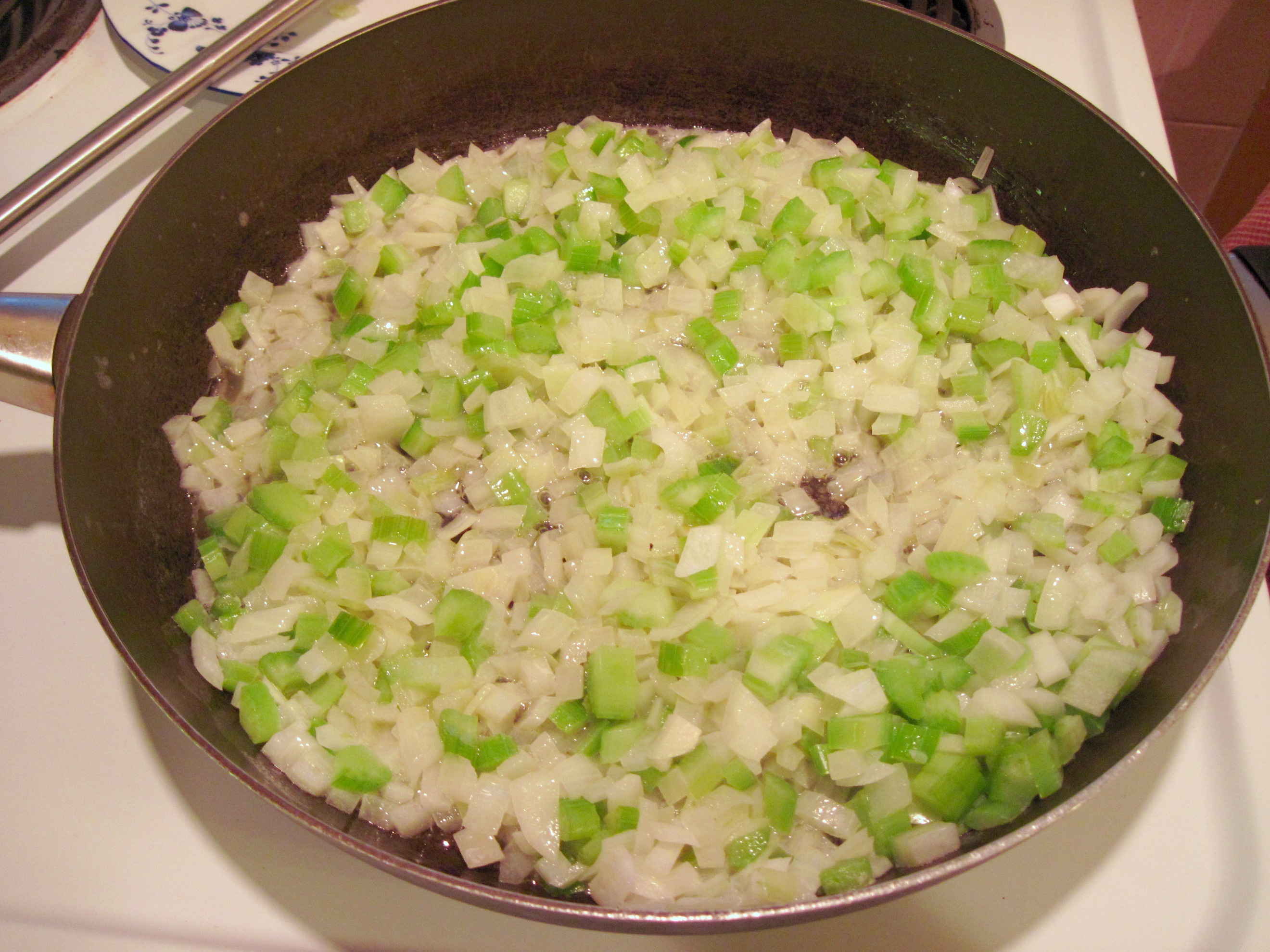 1. Sauté the celery and onion in the 8 tablespoons of butter until it is softened.
