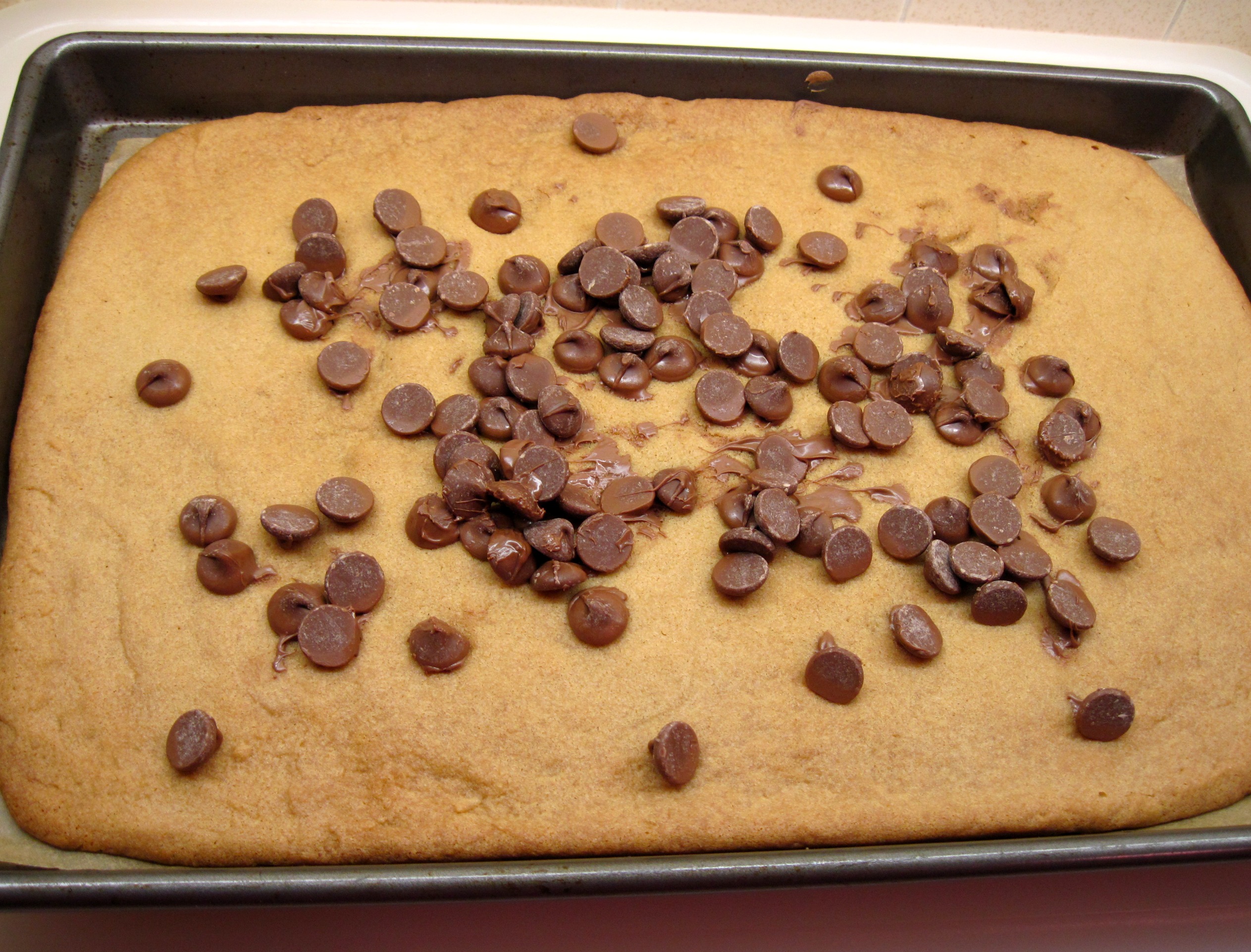 7. Remove from the oven and immediately sprinkle the chocolate chips over the hot cookie.