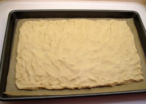 5. Spread the dough on a lightly greased baking sheet so it is a about a 13×10-inch rectangle.* Leave about an inch between the dough and the sides of the baking sheet. (Instead of greasing the pan, you can use parchment paper, as I did.)