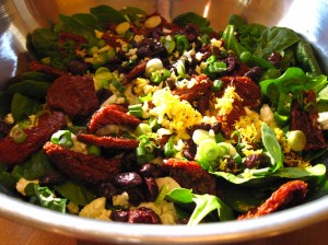 The only oil in the salad is the oil from the sun-dried tomatoes. Not knowing exactly how much oil was in the jar, I was concerned that it would be too much. I took the tomatoes out of the jar and found that there really wasn’t that much oil, so I used it all and it was perfect.