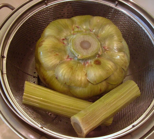 5. When the water is boiling, add the prepared artichoke and stem. Boil for 45 minutes.