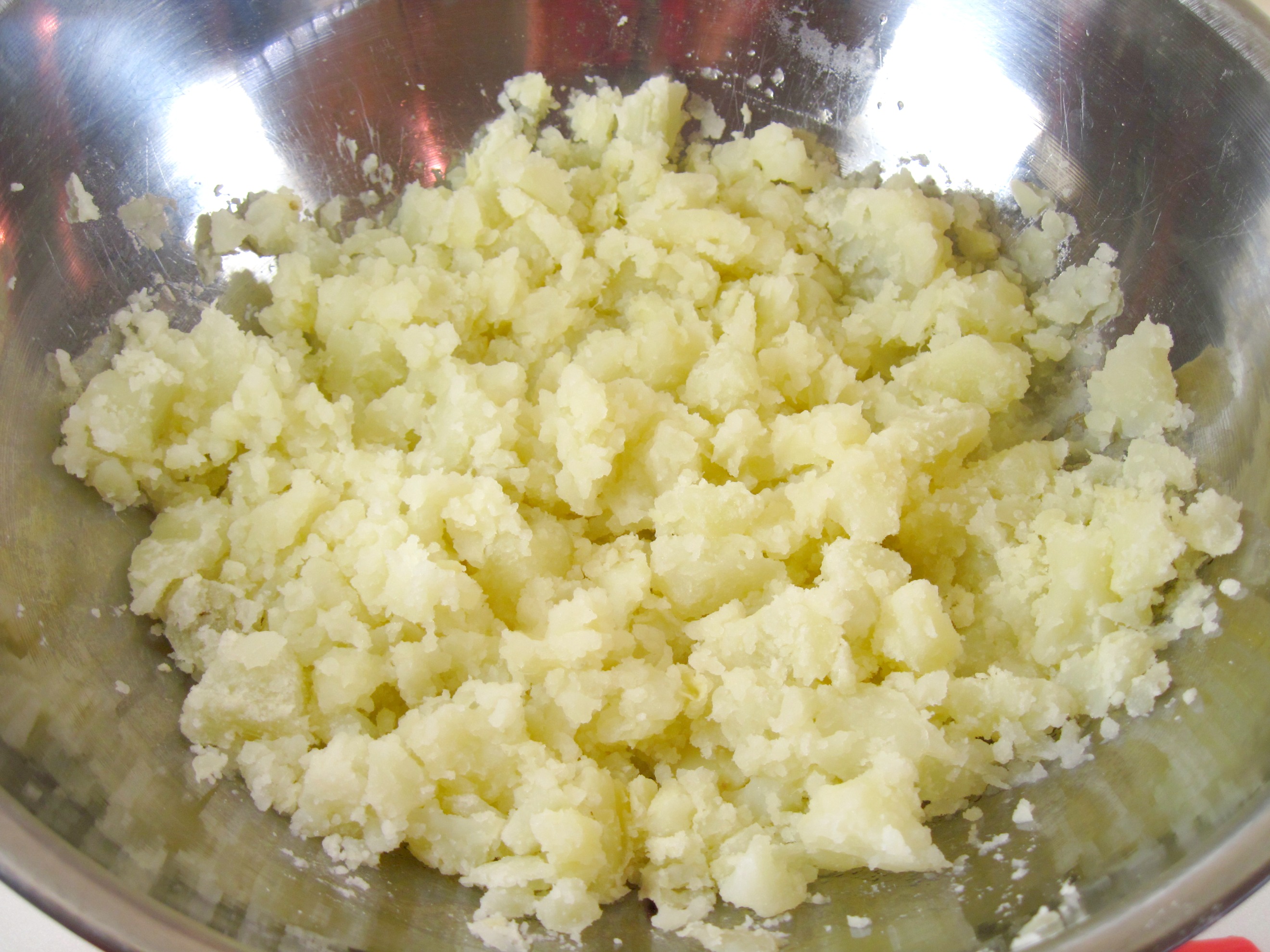 3. Drain the potatoes. Remove the skin and put the potatoes in a large bowl. Using a dinner knife, cut the potatoes in the bowl into chunks.