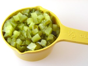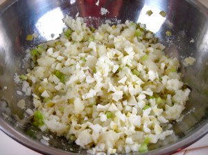 5. When the potatoes are cool, add the chopped onion, celery, pickles and eggs.