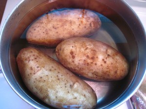 2.  Bring to a boil. Turn the heat down and simmer until done. Depending on the size of the potatoes, it should take about 20 – 30 minutes, or until a knife slips easily into them.