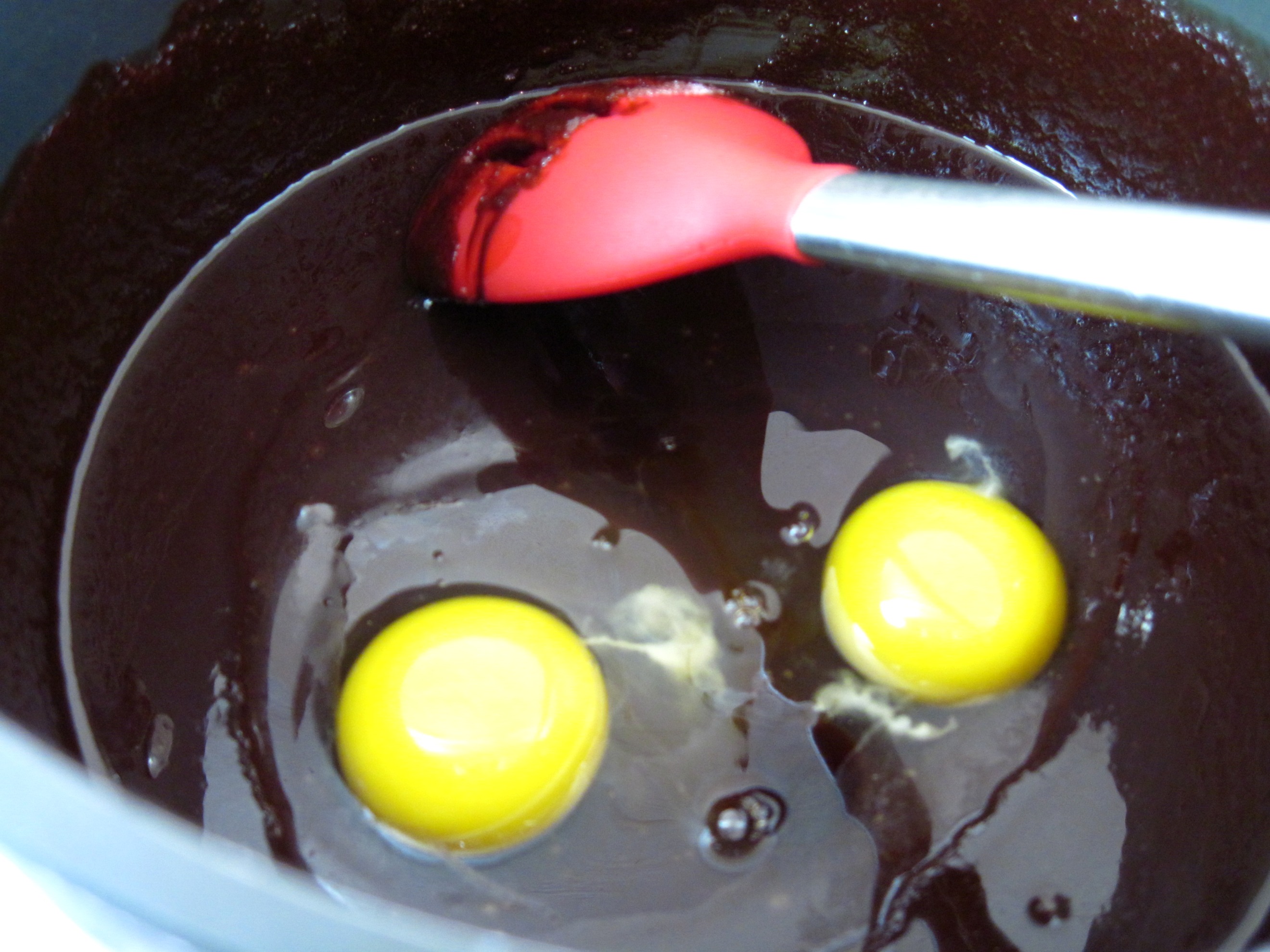 5. Add the eggs and vanilla and “beat it all like mad”*.