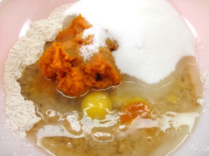 4. Make a well in this mixture. Pour in the oil, eggs, water, pumpkin, and sugar. Mix well with a sturdy spoon. (Add nuts if using.)
