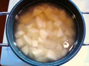 2. Bring to a boil. Cover; reduce hit to a simmer and cook until tender, 20 minutes or so. (Exact time will depend on the size of your potato chunks.)