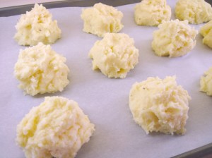 7. If you have one, use a pastry bag with a large star point to pipe the potatoes on a baking sheet. Otherwise, make rounded potato mounds on the baking sheet.